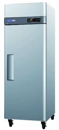 - - Reach-in - One-section - 24 cubic feet - Exterior LED digital thermometer - 1 Hinged solid door with recessed handle and lock - 3 Wire shelves - 400 Stainless steel front and sides - Aluminum interior with stainless steel floor - 4in Swivel casters - Top mount self-contained compressor